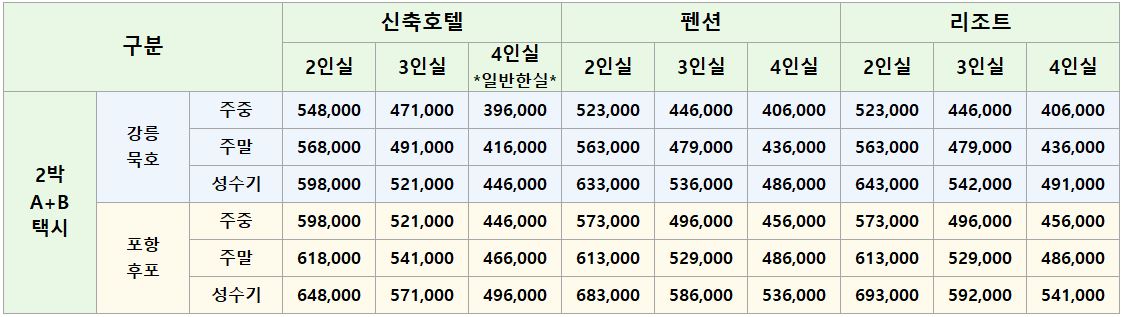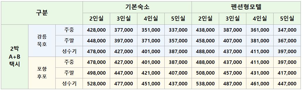 | 포함내역 | 울릉도 왕복선표 + 2박 숙박요금 + 택시투어A코스 + 택시투어B코스 + 행남해안산책로 또는 도동약수공원 + 식사5식(홍합밥/오징어내장탕/따깨비칼국수/백반정식2회) | ||